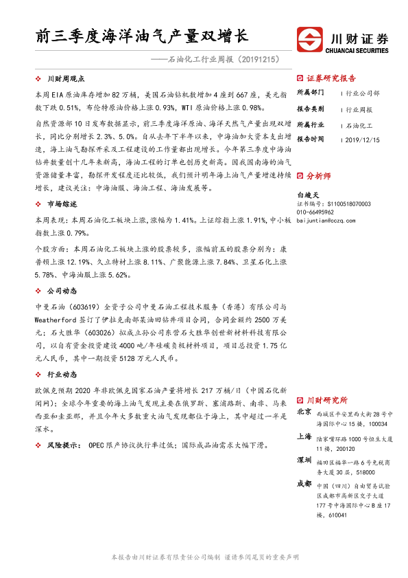 【川财证券】【20191215】石油化工行业周报:前三季度海洋油气产量双增长-11页