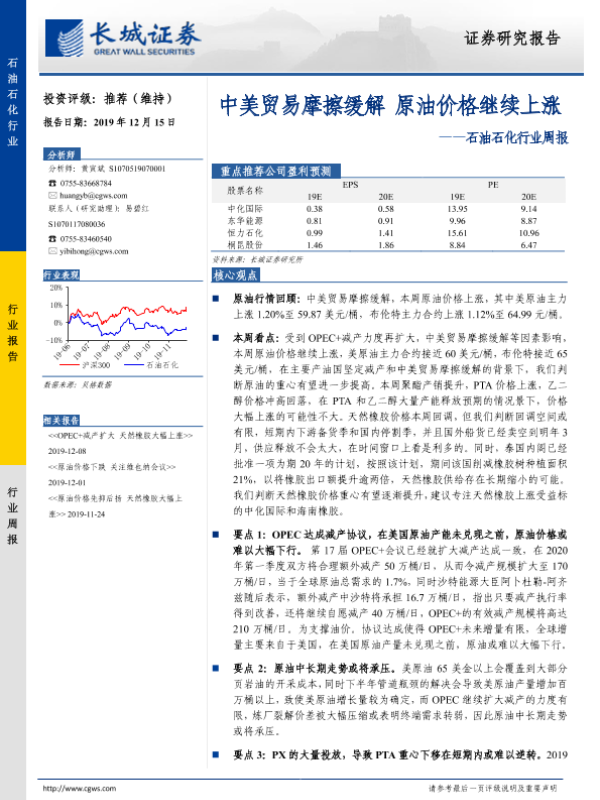 【长城证券】【20191215】20191215-长城证券-石油石化行业周报:中美贸易摩擦缓解 原油价格继续上涨-10页