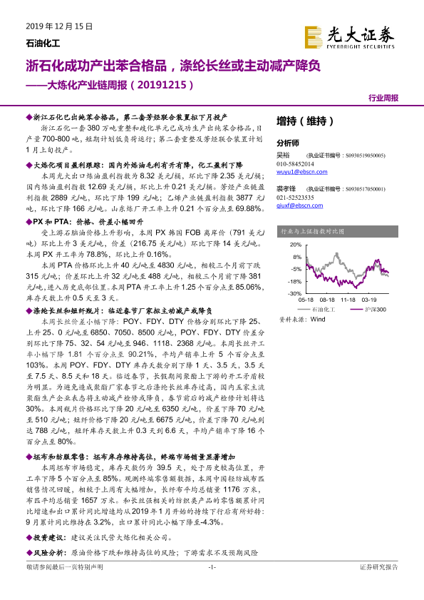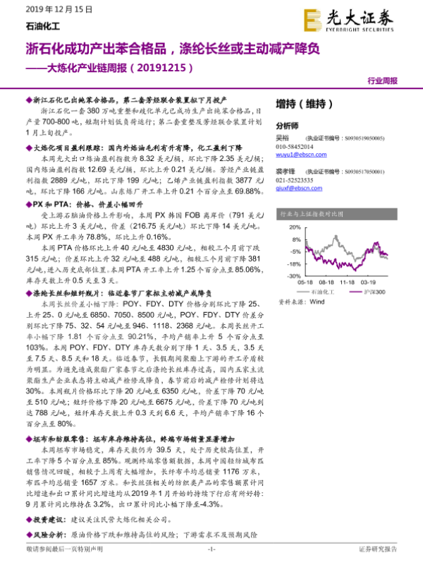 【光大证券】【20191215】大炼化产业链周报:浙石化成功产出苯合格品,涤纶长丝或主动减产降负-12页