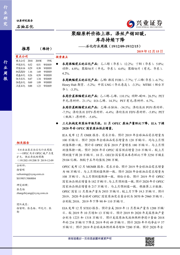【兴业证券】【20191215】20191215-兴业证券-石化行业周报:聚酯原料价格上涨,涤丝产销回暖,库存持续下降-13页