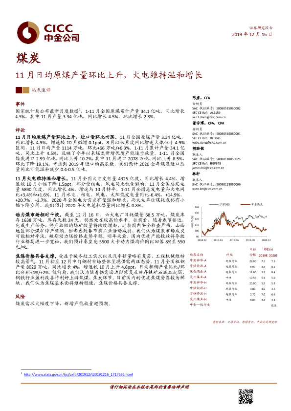 【中金公司】【20191216】煤炭热点速评:11月日均原煤产量环比上升,火电维持温和增长-4页