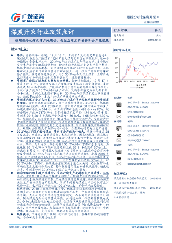 【广发证券】【20191219】20191219-广发证券-煤炭开采行业政策点评:短期供给收缩支撑产地煤价,关注后续复产安排和去产能进展-5页