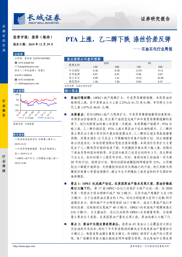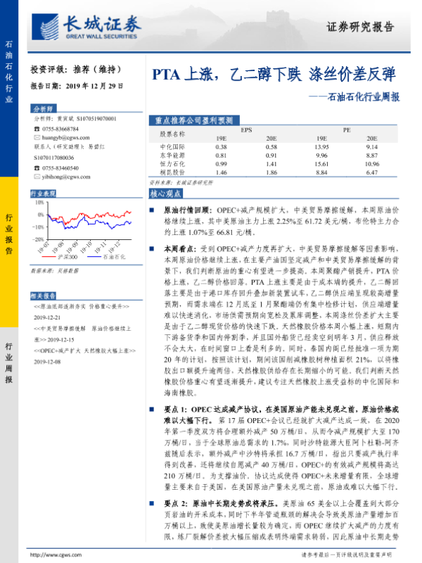 【长城证券】【20191229】20191229-长城证券-石油石化行业周报:PTA上涨,乙二醇下跌涤丝价差反弹-11页