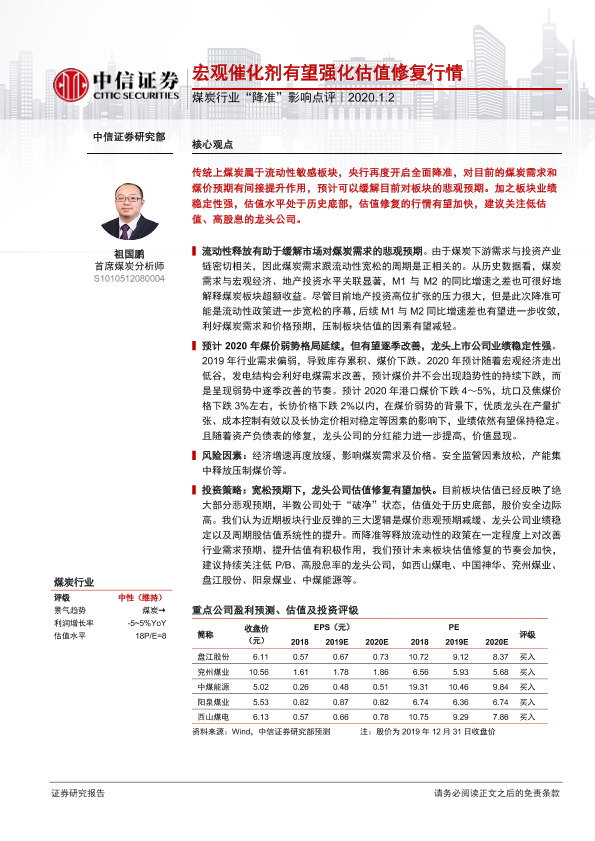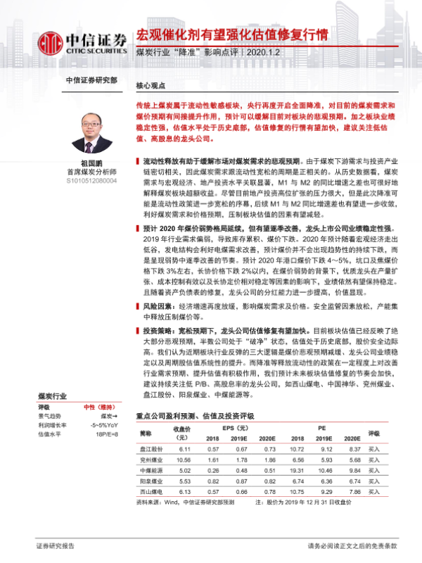 【中信证券】【20200102】煤炭行业“降准”影响点评:宏观催化剂有望强化估值修复行情-7页