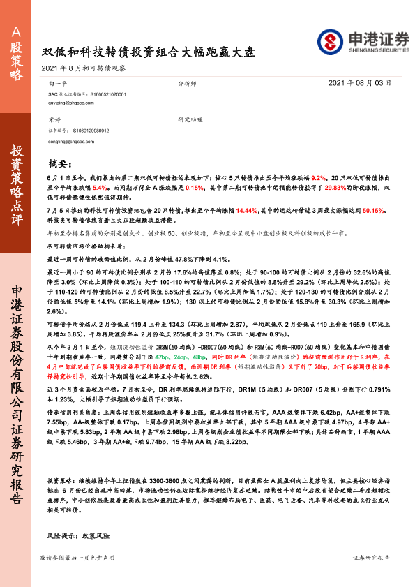 【申港证券】【20210803】2021年8月初可转债观察:双低和科技转债投资组合大幅跑赢大盘-27页