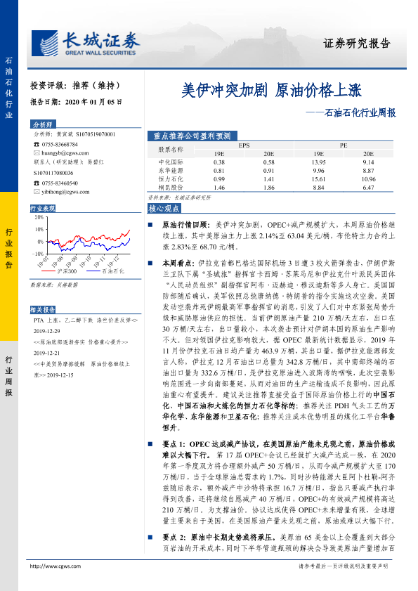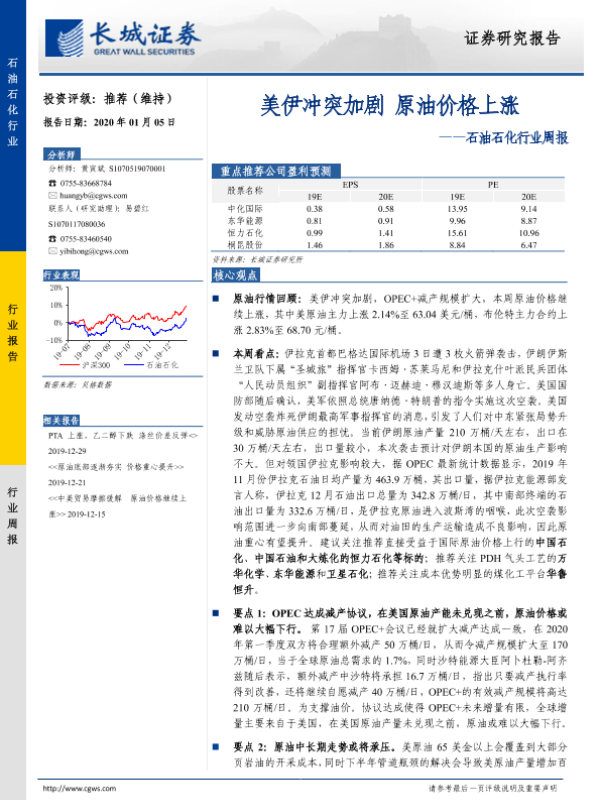 【长城证券】【20200105】20200105-长城证券-石油石化行业周报:美伊冲突加剧 原油价格上涨-11页