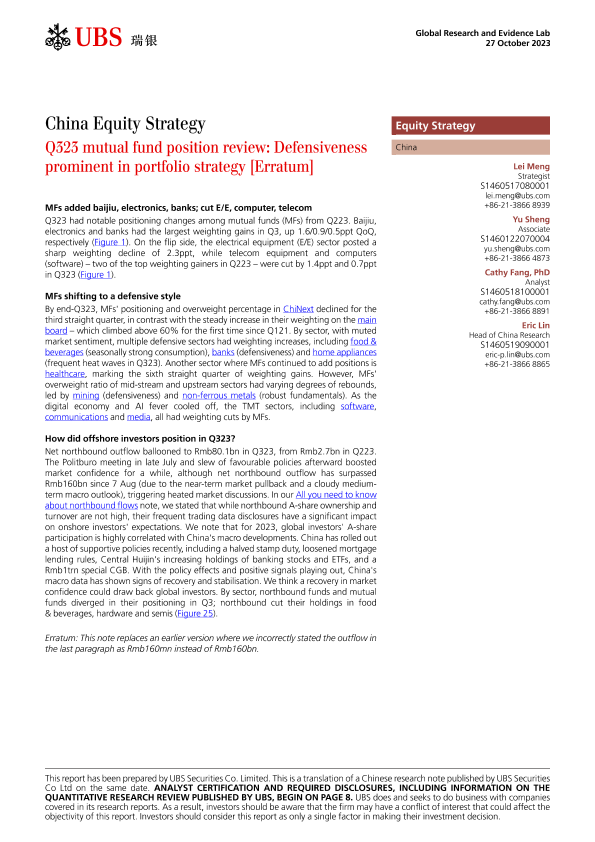 【UBS Securities Co. Limited】【20231027】China Equity Strategy _Q323 mutual fund position review Defensiveness prominent in portfolio strategy-12页