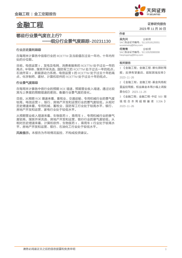 【天风证券】【20231130】细分行业景气度跟踪:哪些行业景气度在上行?-11页