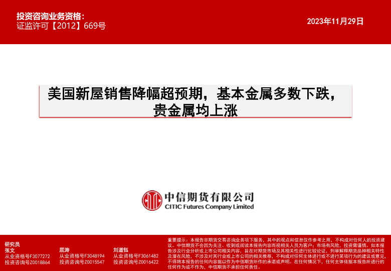 【中信期货】【20231129】美国新屋销售降幅超预期,基本金属多数下跌,贵金属均上涨-16页