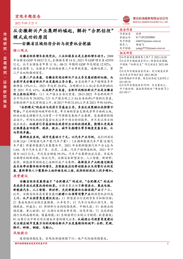 【东亚前海证券】【20220925】安徽省区域经济分析与投资机会挖掘:从安徽新兴产业集群的崛起,解析“合肥创投”模式成功的原因-76页