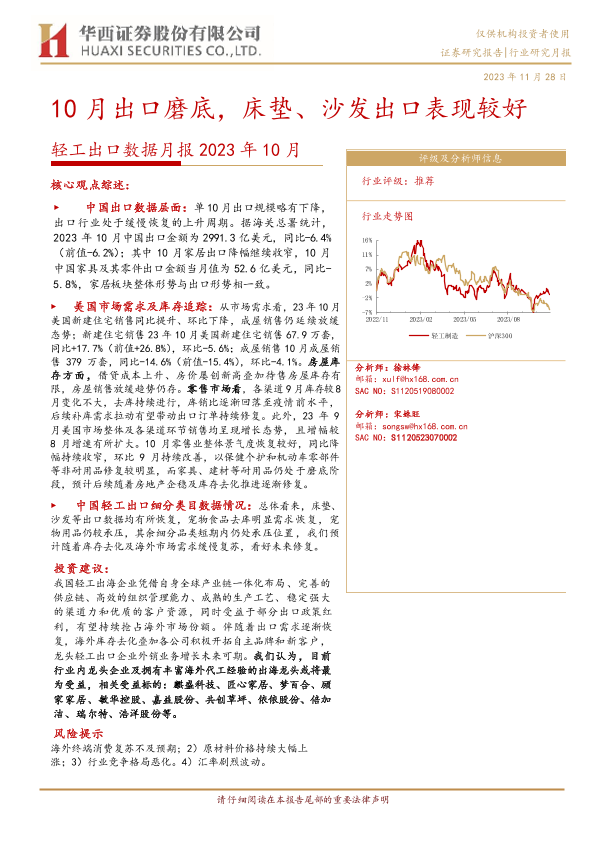 【华西证券】【20231128】轻工出口数据月报2023年10月:10月出口磨底,床垫、沙发出口表现较好-15页