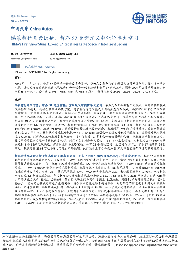 【海通国际】【20231130】鸿蒙智行首秀惊艳,智界S7重新定义智能轿车大空间-14页