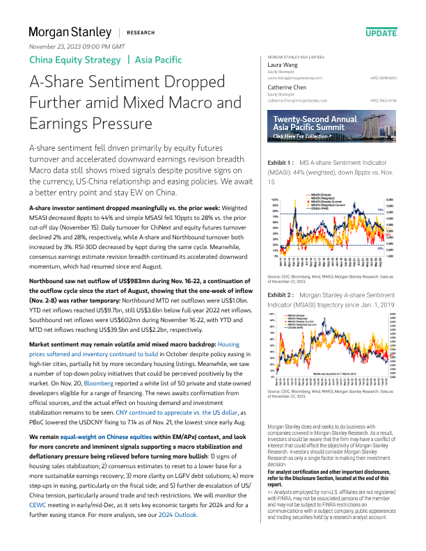 【Morgan Stanley】【20231122】China Equity Strategy A-Share Sentiment Dropped Further amid Mixed Macro and Earnings Pressure-10页