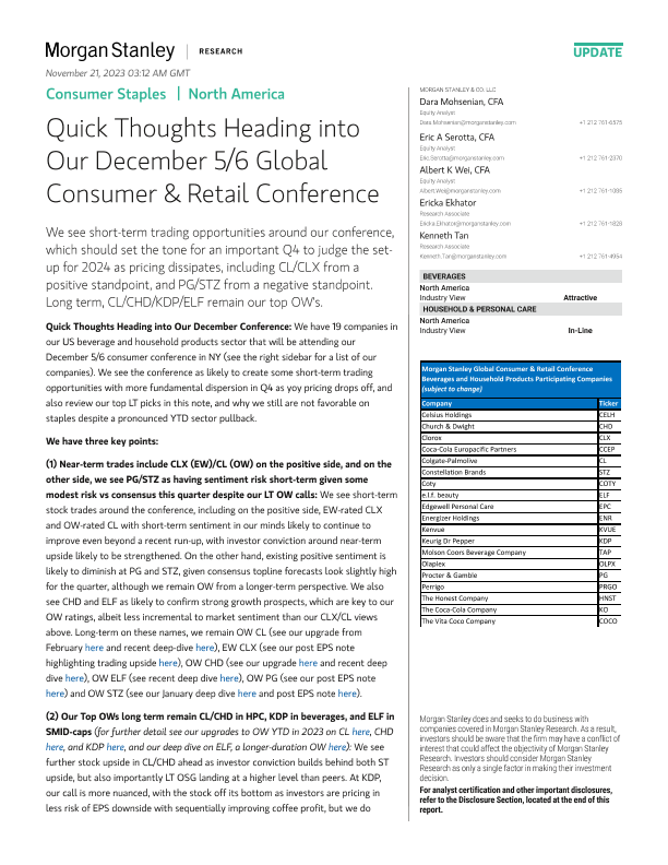 【Morgan Stanley】【2023】Consumer Staples Quick Thoughts Heading into Our December 5/6 Global Consumer & Retail Conference-26页