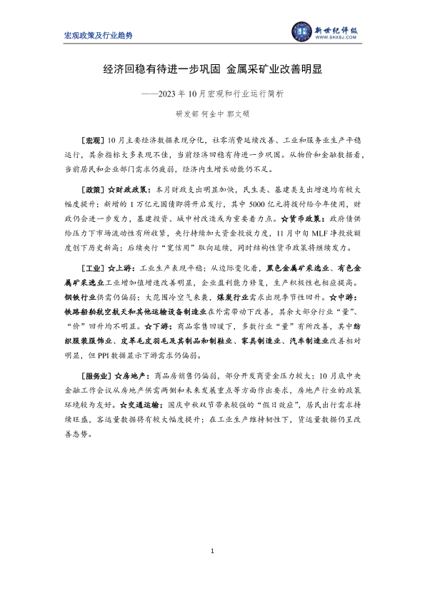 【新世纪评级】【202310】经济回稳有待进一步巩固 金属采矿业改善明显——2023年10月宏观和行业运行简析-11页