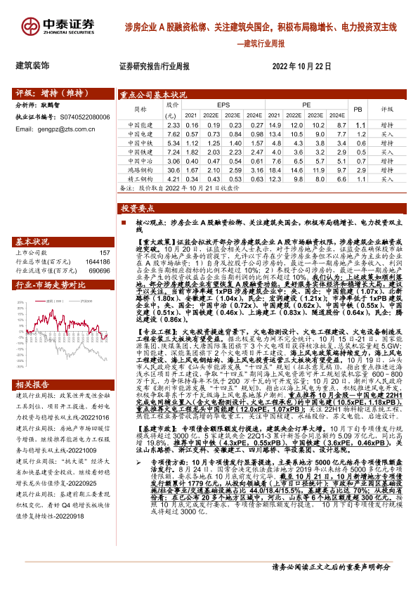 【中泰证券】【20221022】建筑行业周报:涉房企业A股融资松绑、关注建筑央国企,积极布局稳增长、电力投资双主线-25页
