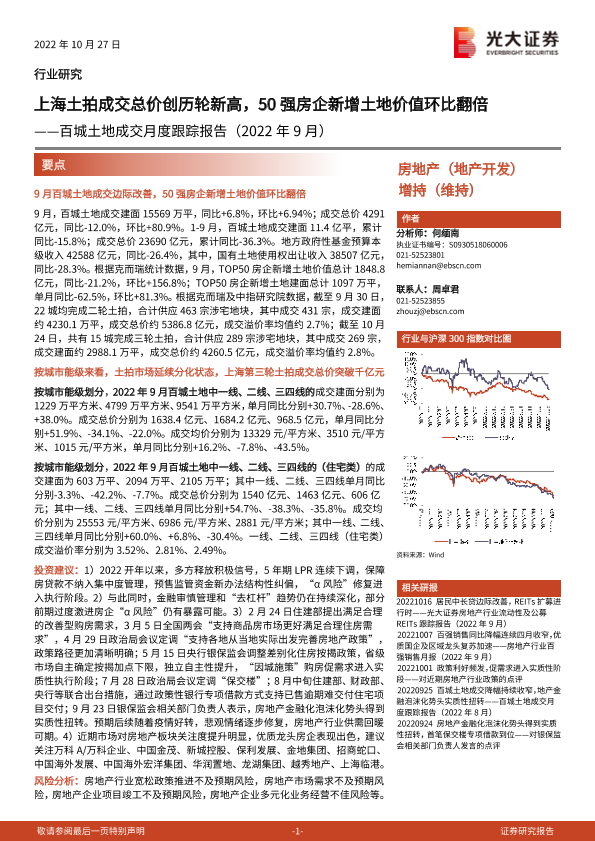 【光大证券】【20221027】房地产行业百城土地成交月度跟踪报告(2022年9月):上海土拍成交总价创历轮新高,50强房企新增土地价值环比翻倍-17页