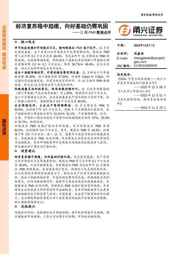 【甬兴证券】【20231211】11月PMI数据点评:经济复苏稳中趋缓,向好基础仍需巩固-10页