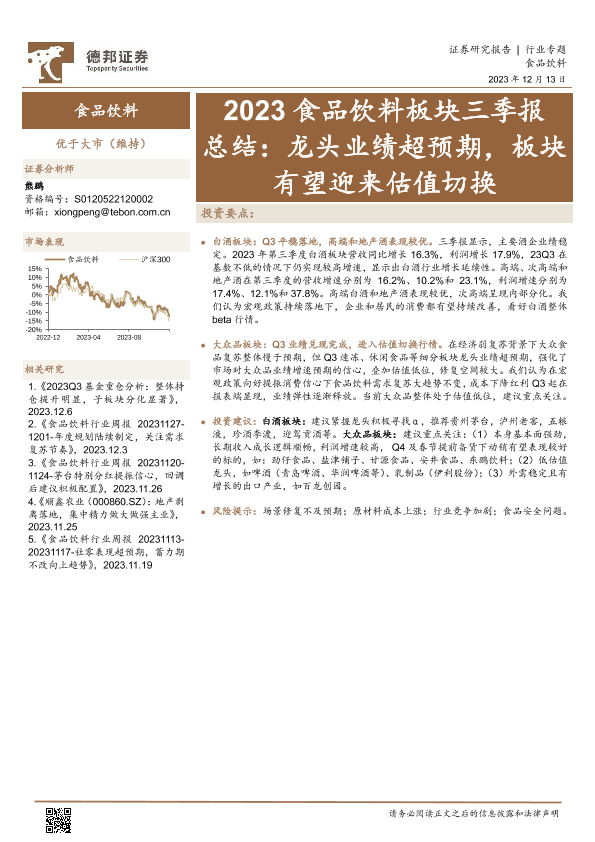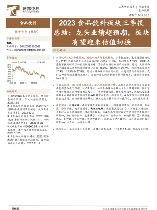 【德邦证券】【20231213】2023食品饮料行业板块三季报总结:龙头业绩超预期,板块有望迎来估值切换-27页