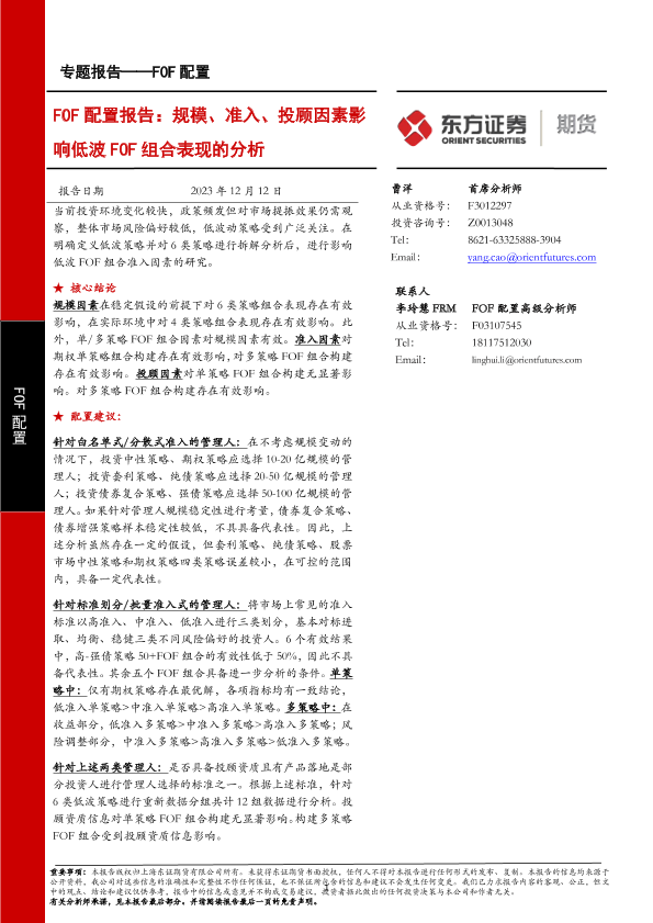 【东证期货】【20231212】FOF配置报告:规模、准入、投顾因素影响低波FOF组合表现的分析-38页