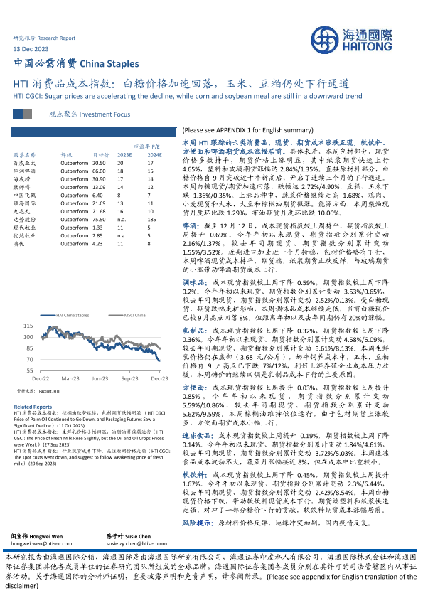 【海通国际】【20231213】中国必需消费:HTI消费品成本指数:白糖价格加速回落,玉米、豆粕仍处下行通道-16页
