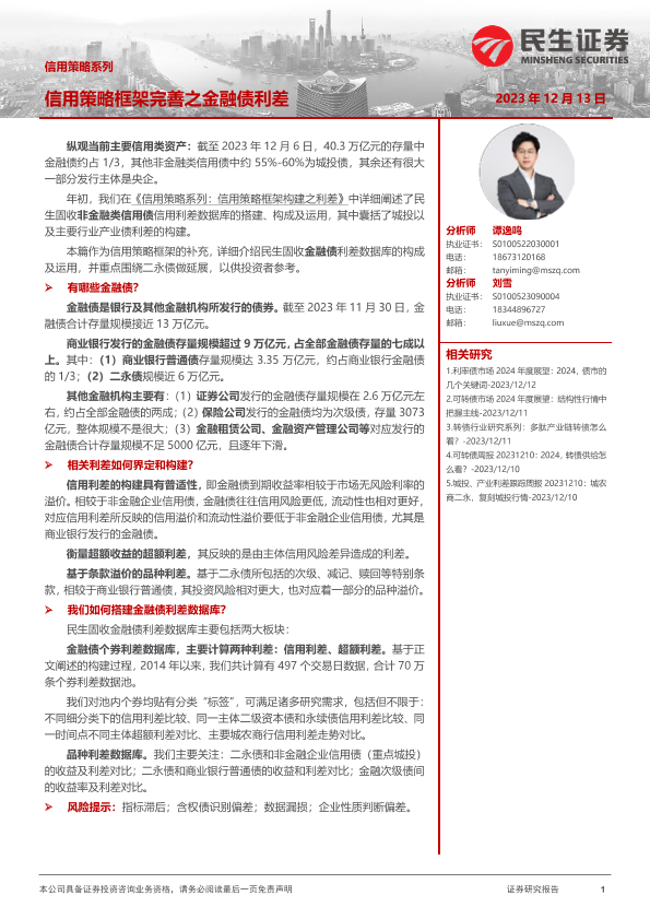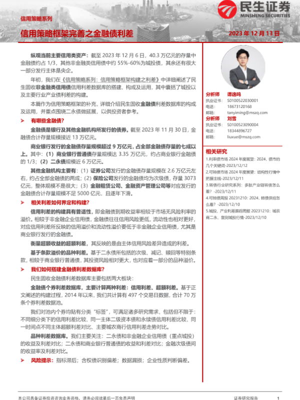 【民生证券】【20231213】信用策略系列:信用策略框架完善之金融债利差-17页