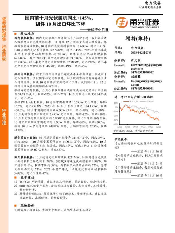 【甬兴证券】【20231207】光伏行业月报:国内前十月光伏装机同比+145%,组件10月出口环比下降-14页