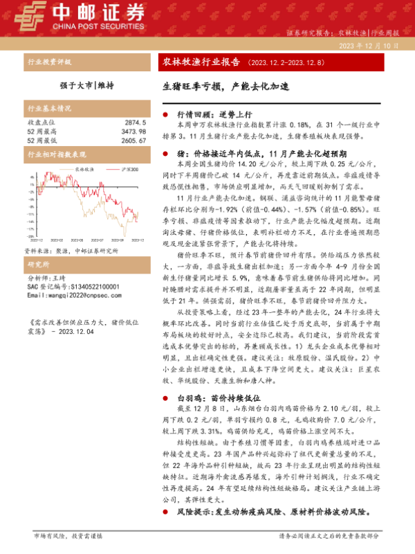 【中邮证券】【20231210】农林牧渔行业报告:生猪旺季亏损,产能去化加速-12页