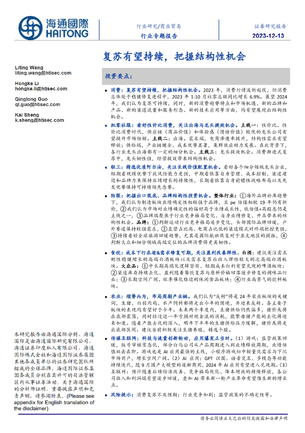 【海通国际】【20231213】商业贸易行业专题报告:复苏有望持续,把握结构性机会-14页