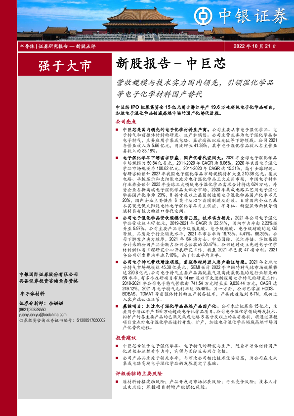 【中银证券】【20221021】新股报告:中巨芯,营收规模与技术实力国内领先,引领湿化学品等电子化学材料国产替代-35页