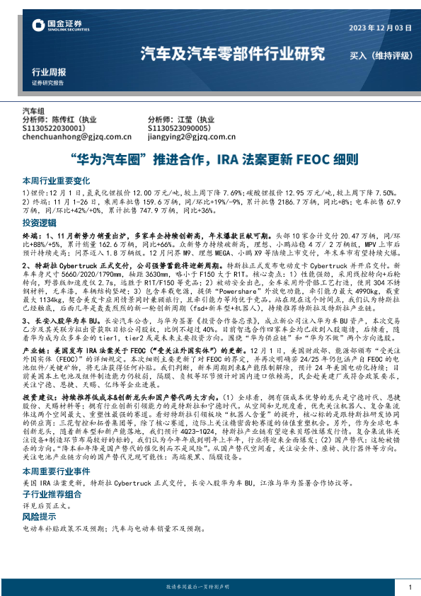 【国金证券】【2023】国金证券:汽车及汽车零部件行业研究-“华为汽车圈”推进合作-IRA法案更新FEOC细则-15页