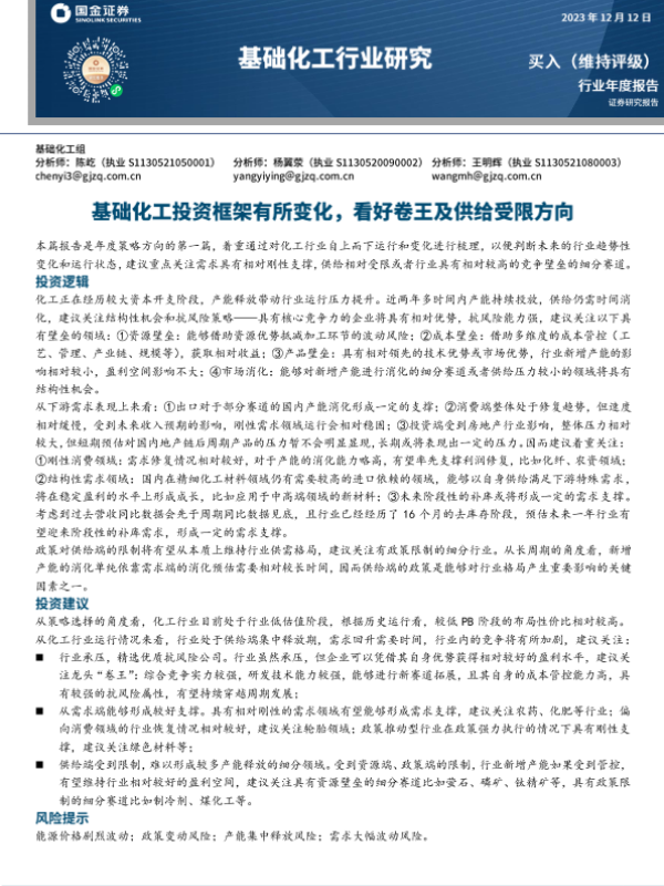 【国金证券】【20231212】基础化工行业年度报告:基础化工投资框架有所变化,看好卷王及供给受限方向-46页