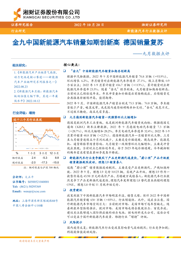 【湘财证券】【20221020】新能源汽车行业九月数据点评:金九中国新能源汽车销量如期创新高,德国销量复苏-16页