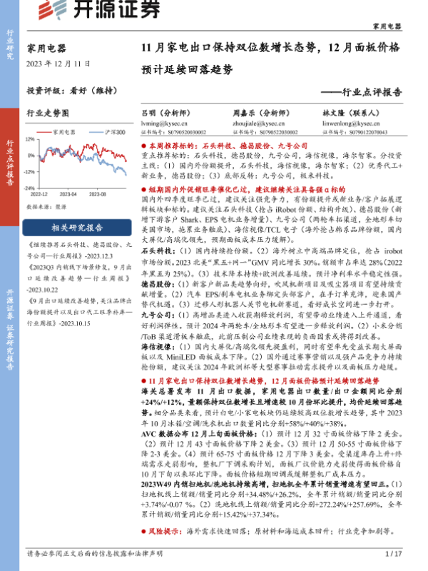【开源证券】【20231211】家用电器行业点评报告:11月家电出口保持双位数增长态势,12月面板价格预计延续回落趋势-17页