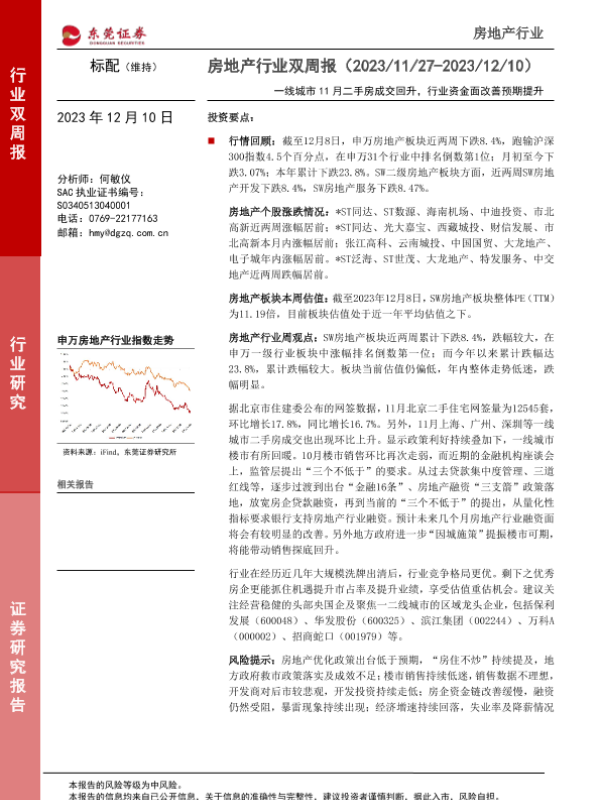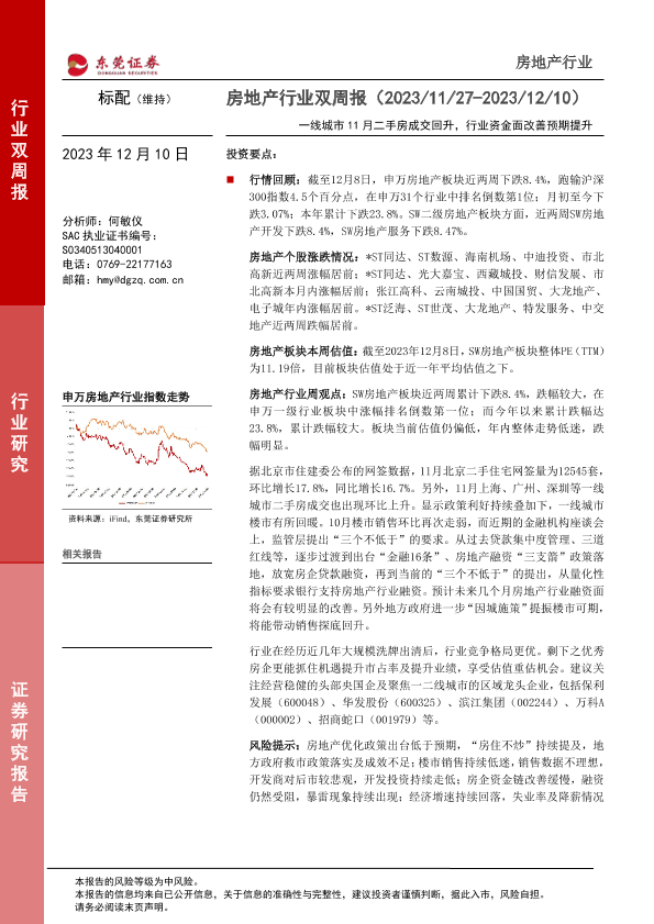 【东莞证券】【20231210】房地产行业双周报:一线城市11月二手房成交回升,行业资金面改善预期提升-12页