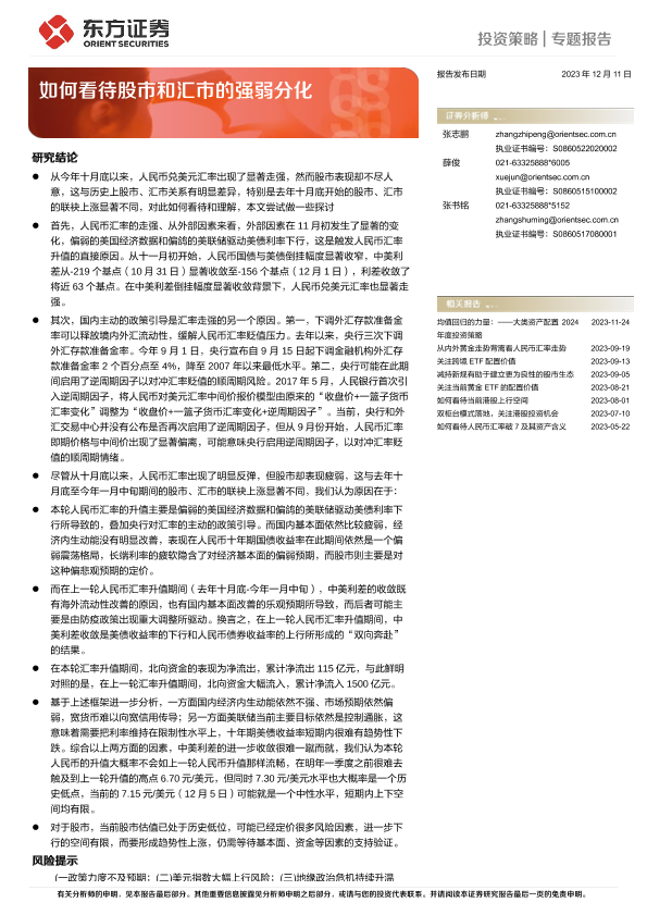 【东方证券】【20231211】投资策略专题报告:如何看待股市和汇市的强弱分化-11页