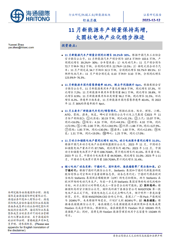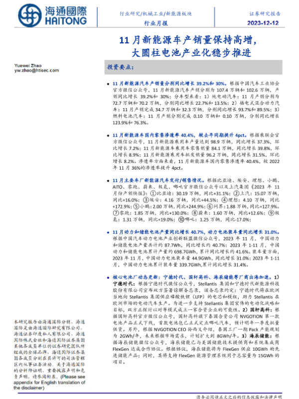【海通国际】【20231212】11月新能源车产销量保持高增,大圆柱电池产业化稳步推进-11页