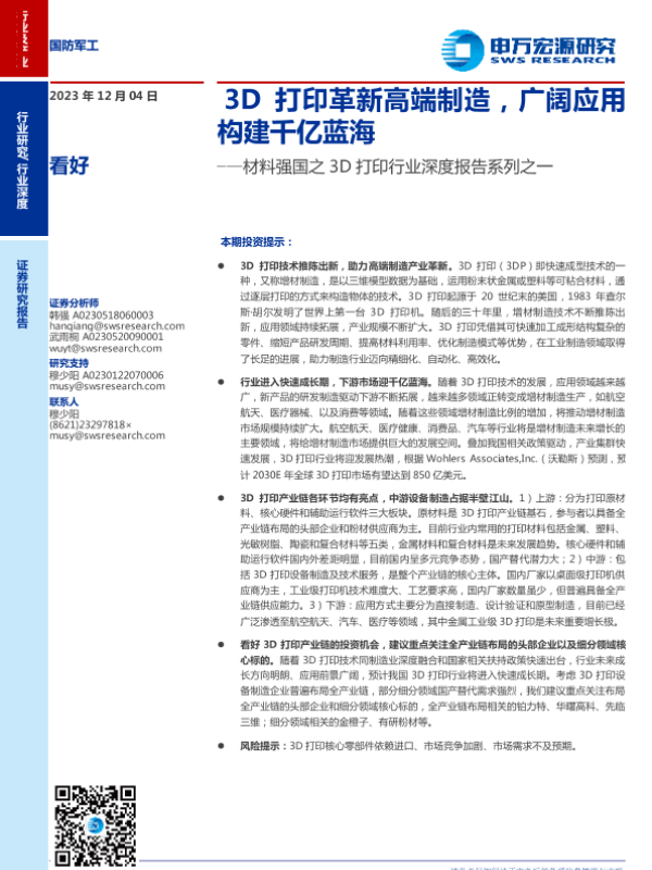 【申万宏源】【20231204】材料强国之3D打印行业深度报告:3D打印革新高端制造,广阔应用构建千亿蓝海-30页