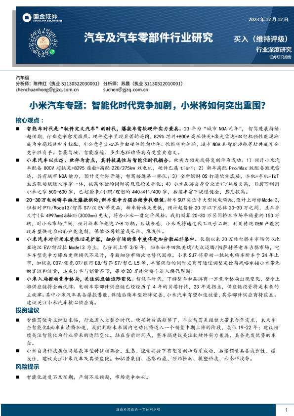【国金证券】【20231212】汽车及汽车零部件行业研究:小米汽车专题:智能化时代竞争加剧,小米将如何突出重围?-25页