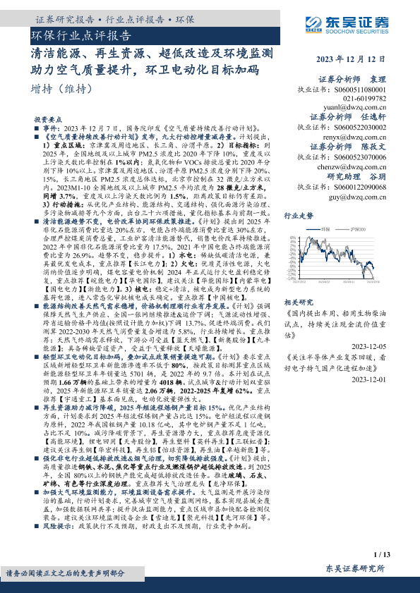【东吴证券】【20231212】环保行业点评报告:清洁能源、再生资源、超低改造及环境监测助力空气质量提升,环卫电动化目标加码-13页