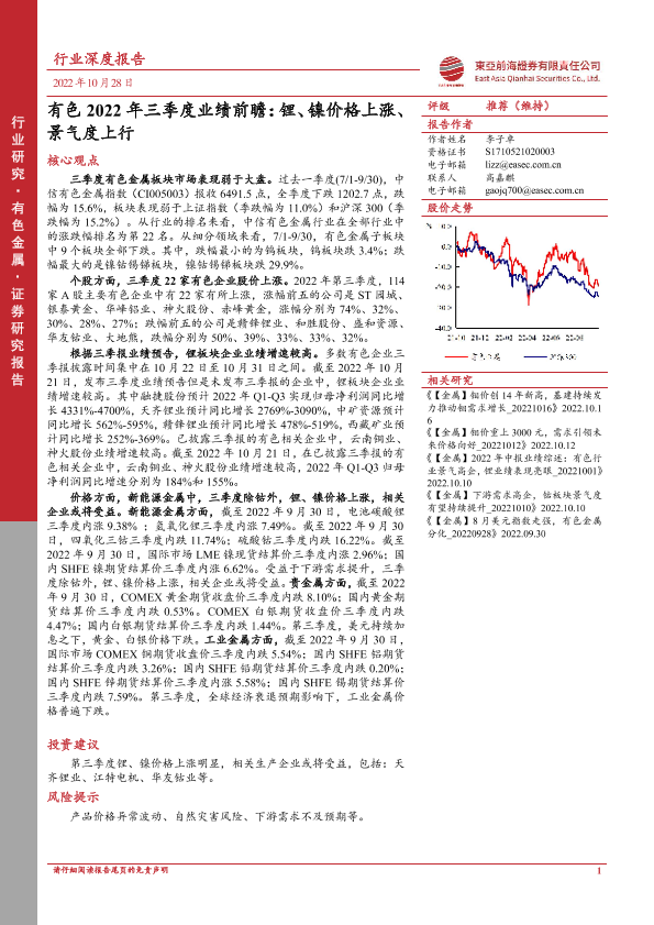 【东亚前海证券】【20221028】有色2022年三季度业绩前瞻:锂、镍价格上涨、景气度上行-15页