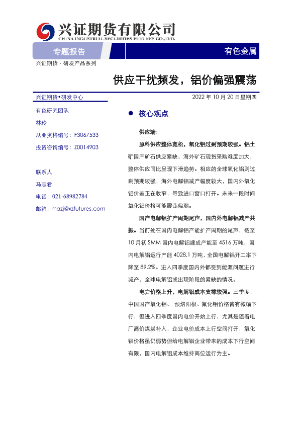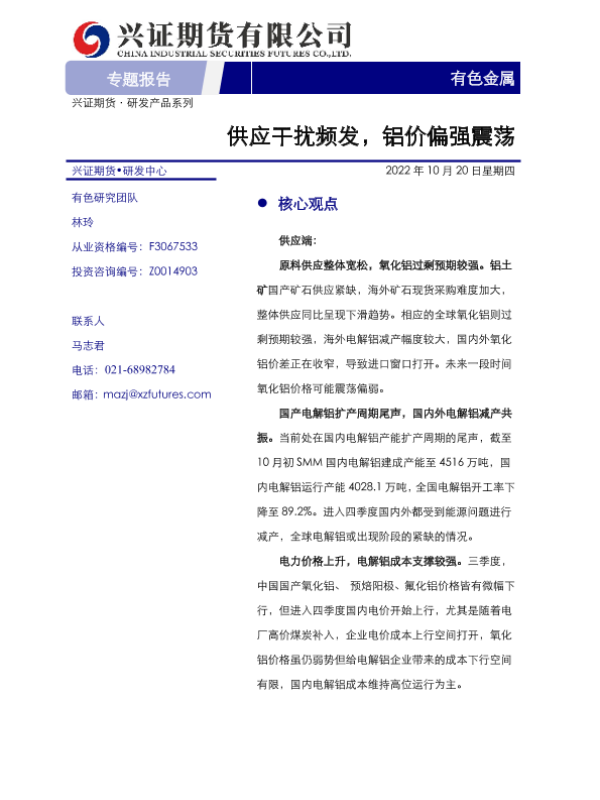 【兴证期货】【20221020】有色金属专题报告:供应干扰频发,铝价偏强震荡-20页