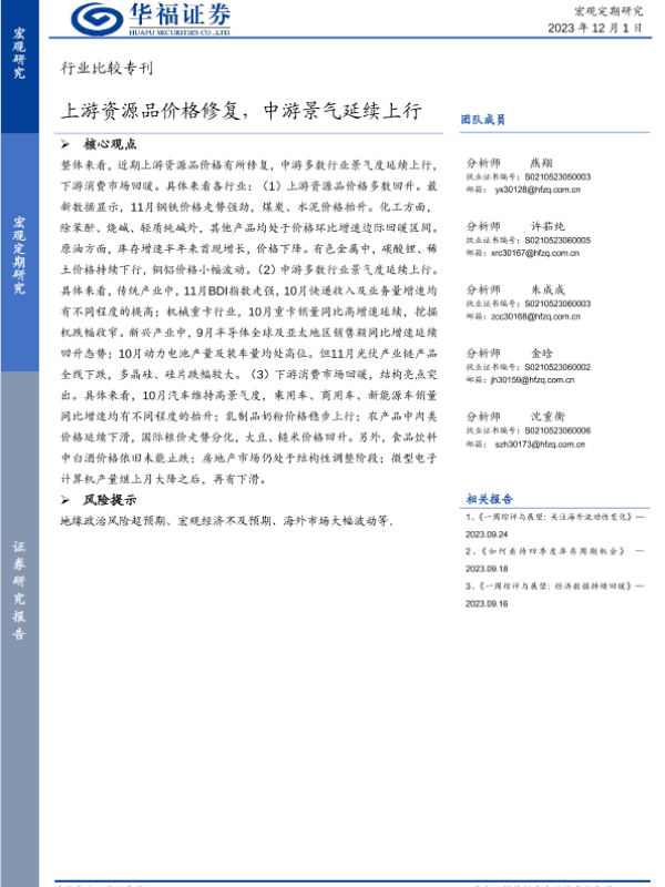 【华福证券】【20231201】行业比较专刊:上游资源品价格修复,中游景气延续上行-20页