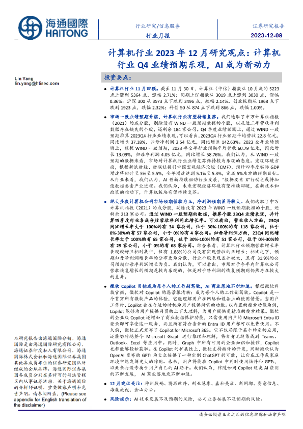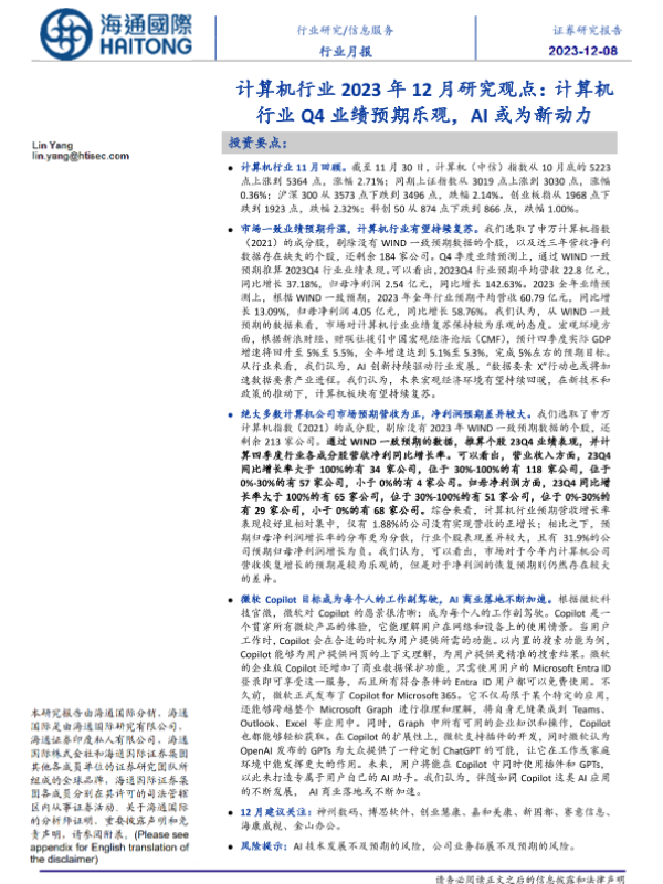 【海通国际】【20231208】计算机行业2023年12月研究观点:计算机行业Q4业绩预期乐观,AI或为新动力-12页