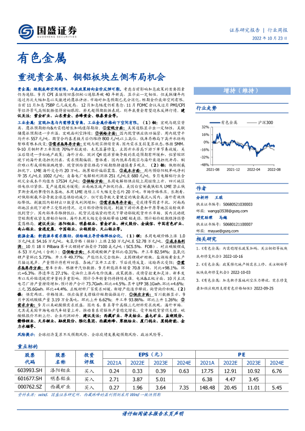 【国盛证券】【20221023】有色金属行业周报:重视贵金属、铜铝板块左侧布局机会-20页
