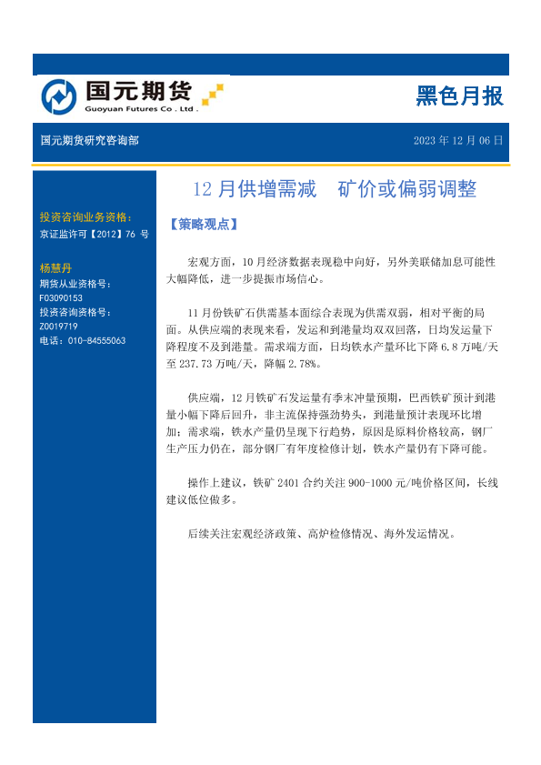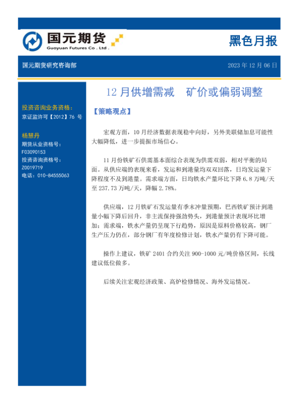 【国元期货】【20231206】黑色月报:12月供增需减 矿价或偏弱调整-14页