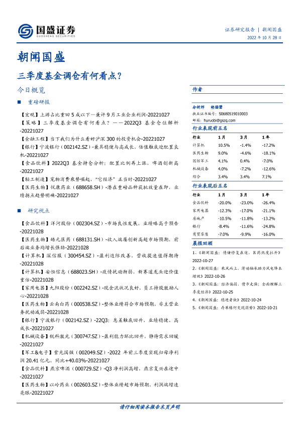 基金调仓 投资机会 沪深300 行业分析 证券研究