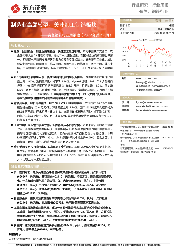 【东方证券】【20221023】有色钢铁行业周策略(2022年第42周):制造业高端转型,关注加工制造板块-40页