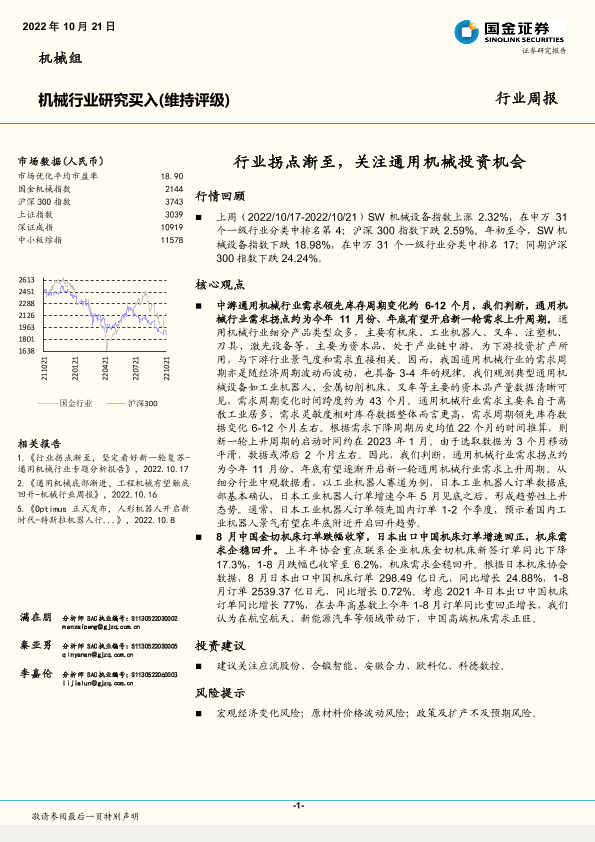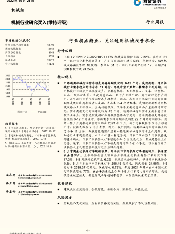 【国金证券】【20221021】机械行业周报:行业拐点渐至,关注通用机械投资机会-20页