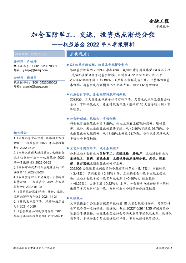 【华安证券】【20221026】权益基金2022年三季报解析:加仓国防军工、交运,投资热点渐趋分散-18页